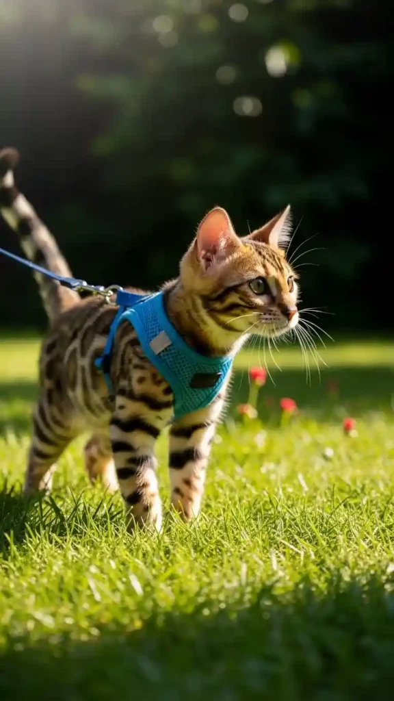 Bengal kittens adapt quickly to walking on a leash and harness — a rare trait among cats. This allows for safe, supervised outdoor time, which enriches their lives with new smells, sights, and experiences.