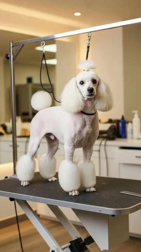 This style leaves a short body coat with full legs, a puffed chest, and defined “boots” on the feet. The English Saddle Clip is balanced and elegant, perfect for showcasing the Poodle’s shape.
