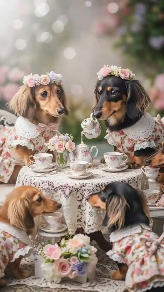 Imagine a delightful tea party where wiener dogs are dressed in adorable floral outfits, sitting politely around a tiny table. This sweet and whimsical scene instantly brings cozy vibes and feels like a storybook moment made just for dog lovers.
