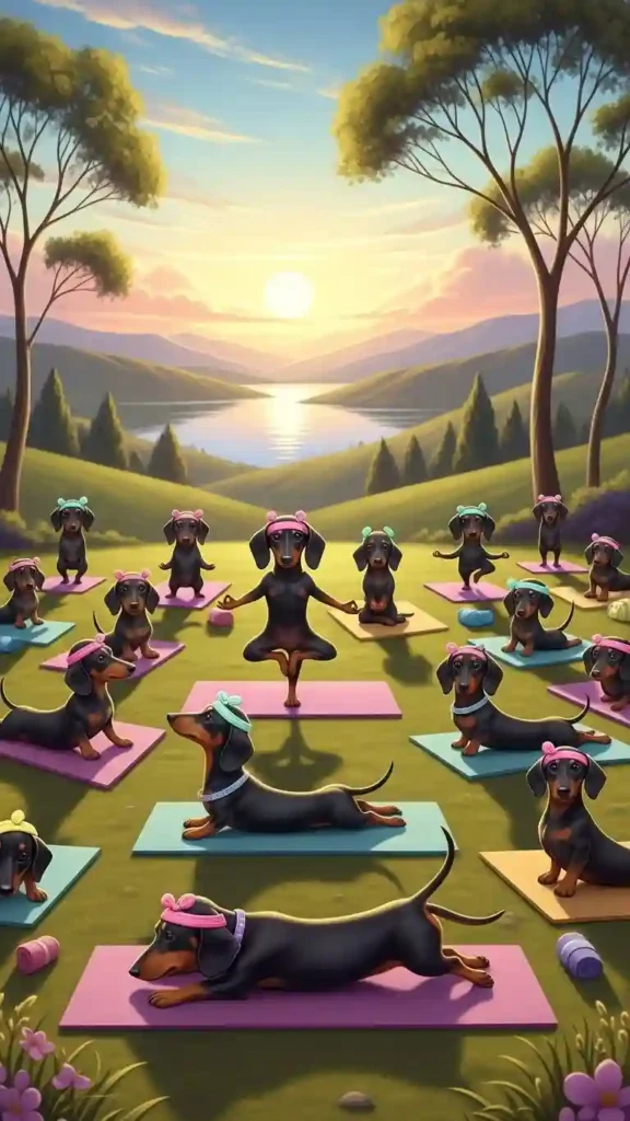 At a peaceful yoga retreat, wiener dogs strike playful poses on tiny mats surrounded by nature. Their flexible bodies and calm expressions create a humorous yet relaxing scene.