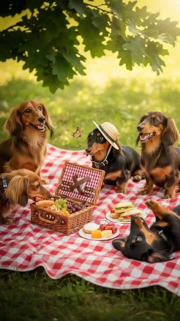 A sunny picnic day becomes even better with wiener dogs enjoying tasty treats on a cozy blanket. Their happy faces and relaxed poses capture pure outdoor joy.