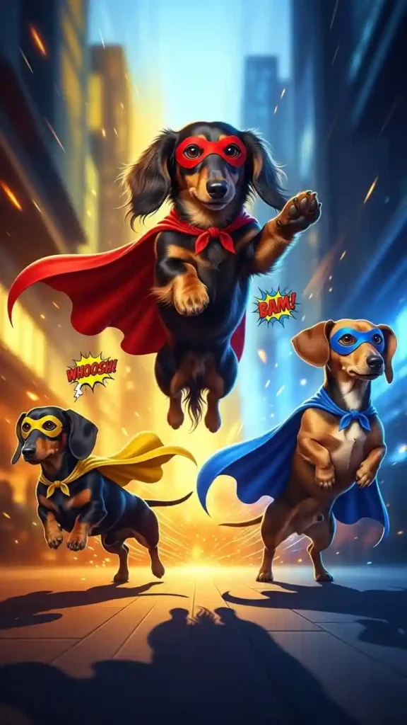 Tiny but brave, wiener dogs dressed as superheroes bring imagination to life. Wearing colorful capes, they stand proudly, ready to save the day with their fearless attitude.
