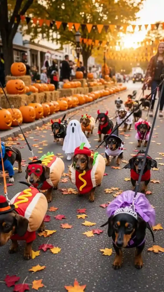 A festive Halloween parade comes alive with costumed wiener dogs trotting through an autumn scene. Pumpkins, fall leaves, and creative outfits set a magical mood.