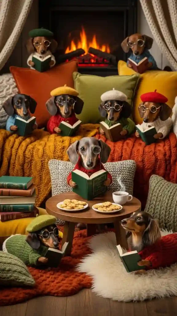 In a cozy reading corner, wiener dogs relax beside tiny books and soft blankets. Their calm poses create a peaceful and charming atmosphere.
