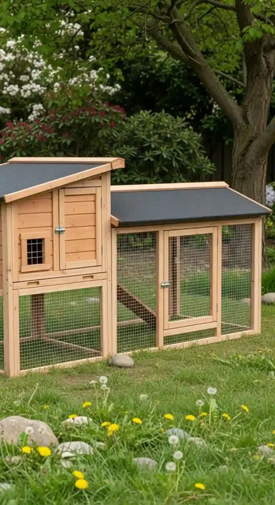 Built with treated wood and waterproof roofing, this design protects rabbits from rain, sun, and wind year-round.
