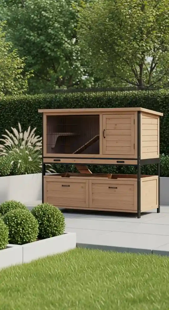 Clean lines, smooth finishes, and natural wood tones create a modern hutch that feels like outdoor furniture rather than a cage.