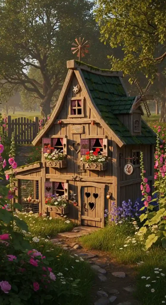 Rustic wood, sloped roofs, and charming details give this hutch a cozy farmhouse feel that suits country-style backyards.