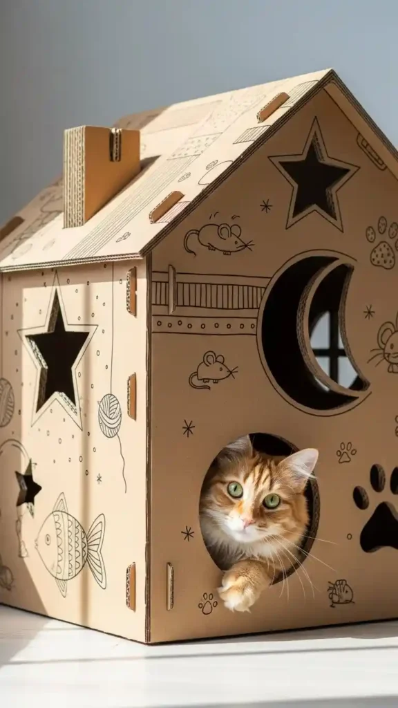 Cardboard cat houses are a timeless favorite — and for good reason. Cats adore cardboard for its texture, insulation, and den-like feel. This design can be as simple as a decorated cardboard box with an entrance hole or stacked boxes turned into a multi-room playground.