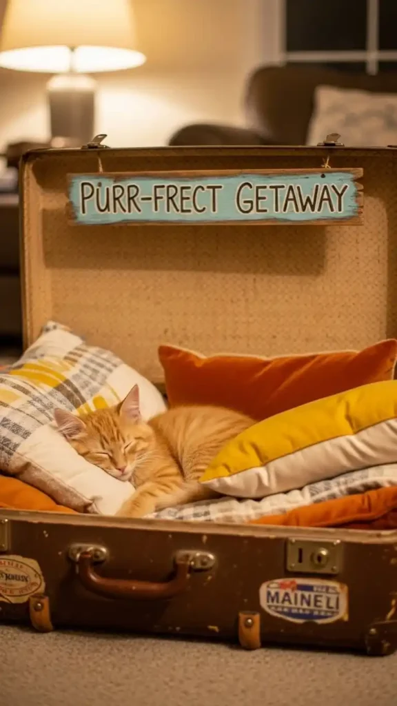 A growing trend among cat lovers is turning vintage suitcases or wicker baskets into colorful cat houses. Add comfy pillows, a soft blanket, and an entrance cut-out — your cat gets a cozy space, and you get a stylish décor piece with personality.