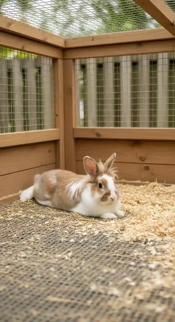 Dig-proof flooring with soft bedding on top works best. It prevents escapes while keeping rabbits comfortable and safe.