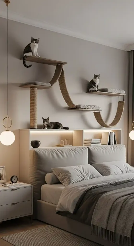 Install narrow shelves behind or beside the headboard for climbing, lounging, and quiet observation.