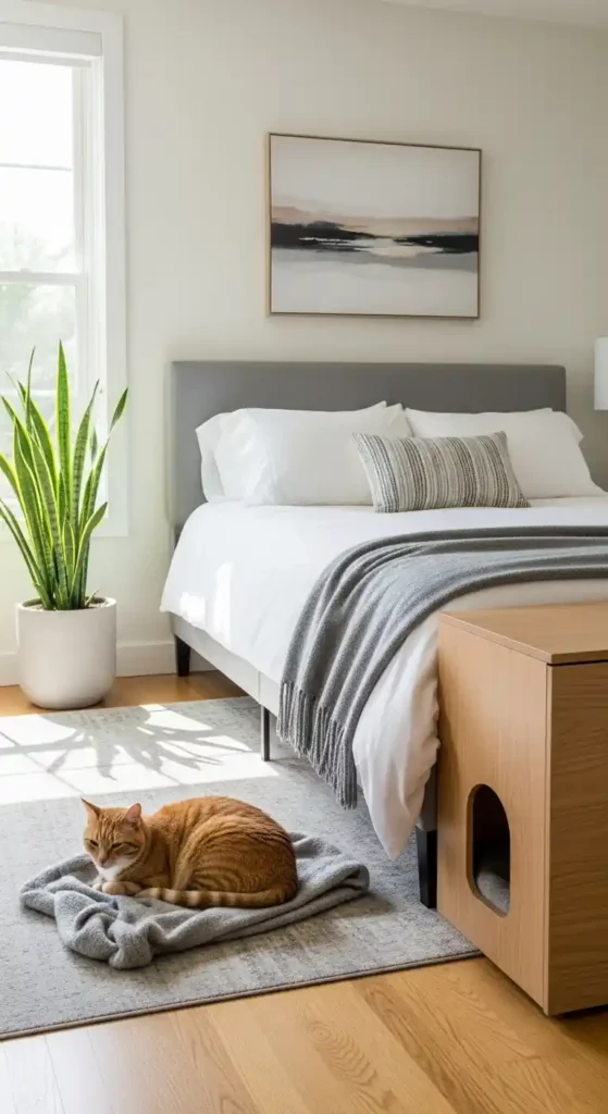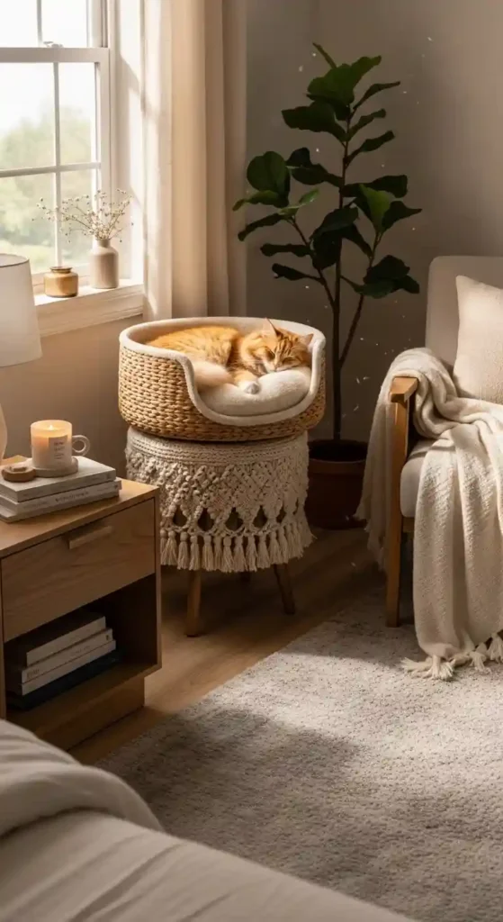 Select a stylish cat bed in neutral tones so it blends seamlessly into your bedroom aesthetic.