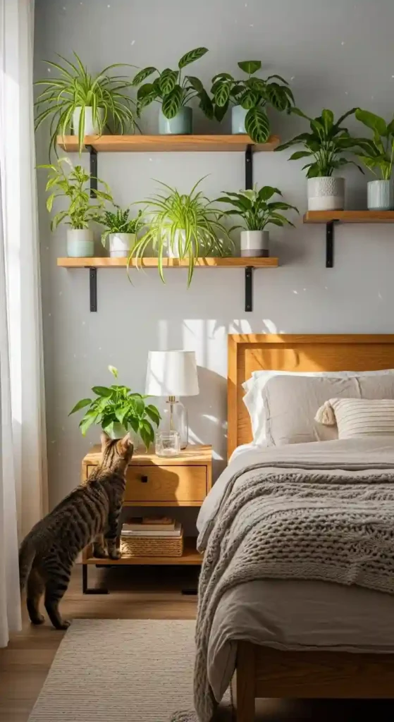 Add greenery using cat-safe plants to create a relaxing, natural vibe.