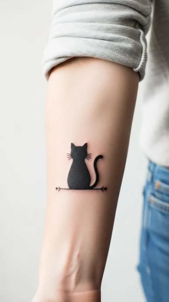 A simple black cat silhouette tattoo is perfect for beginners. Its clean lines and small size make it easy to place anywhere on the body.