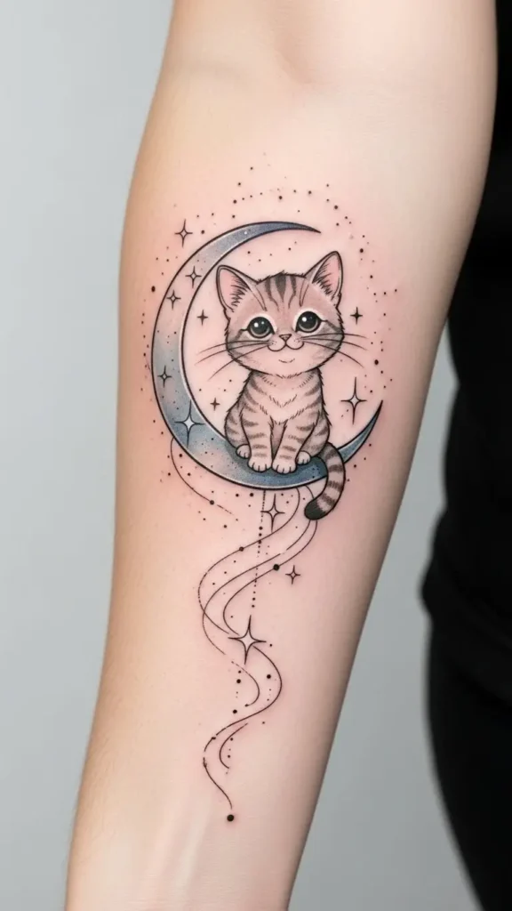 A cat sitting on or near a crescent moon creates a magical, mystical vibe. The tattoo combines feline charm with celestial elements.