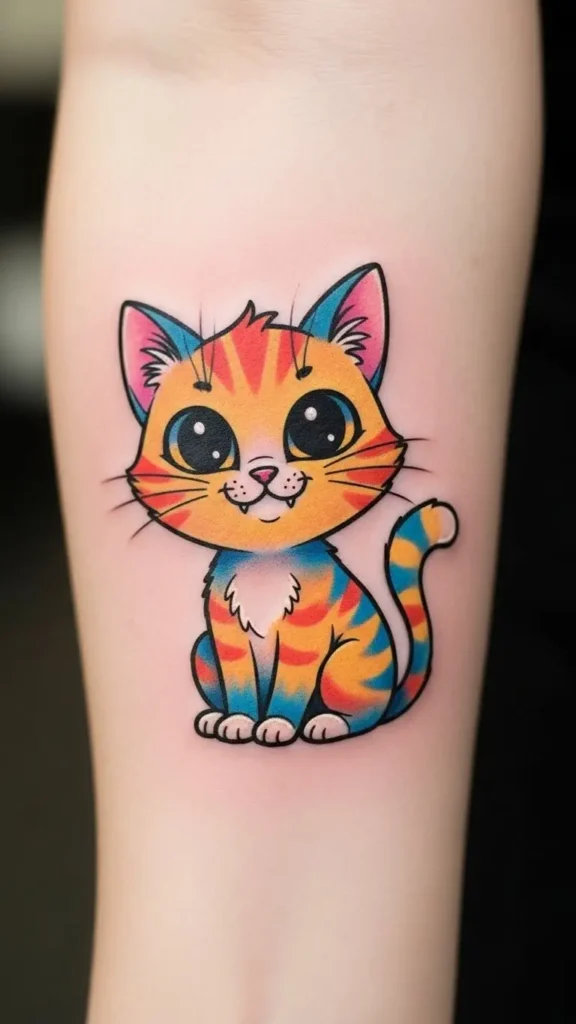 A tiny cartoon cat tattoo brings a playful, whimsical vibe. Bright colors or black outlines make it charming and expressive.