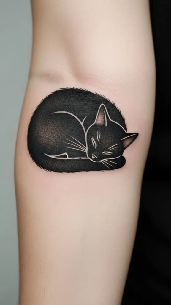 Ideal for forearms or ankles, it’s easy to ink and low-maintenance. First-timers often choose sleeping cat tattoos for their minimal pain and aesthetic charm.
