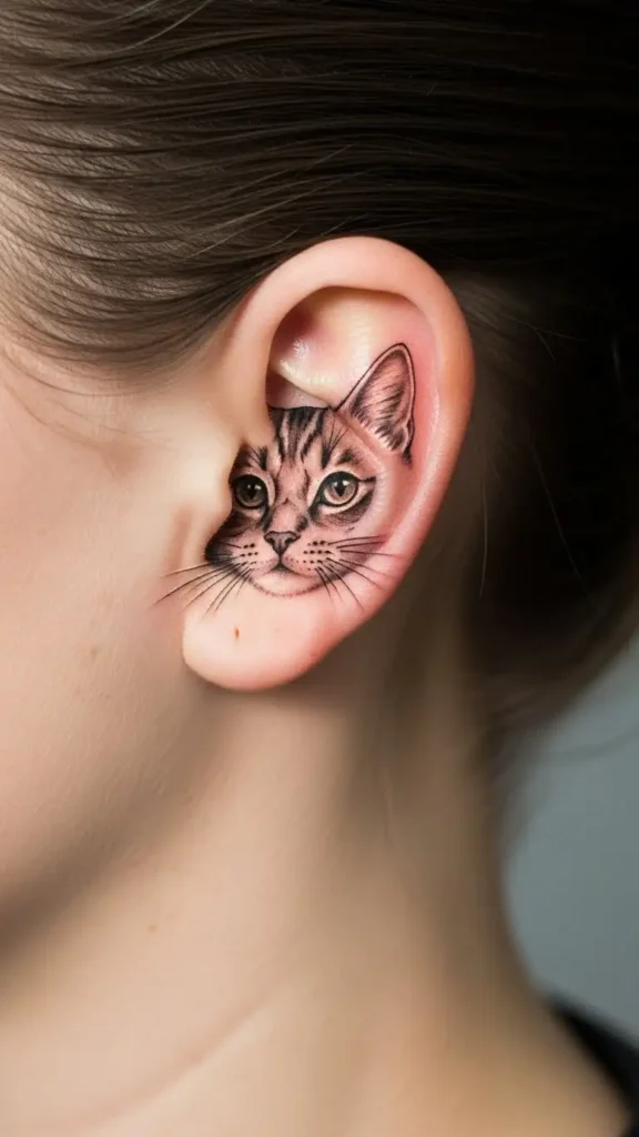 A small cat face tattoo focuses on expression rather than full-body details. It can include eyes, ears, and whiskers for a cute effect.