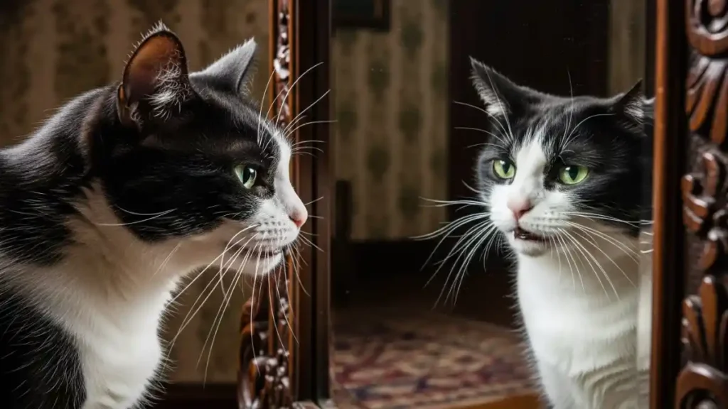 Cats encountering mirrors for the first time often react with confusion or dramatic curiosity. Some hiss, others stare intensely, and some even try to play with their reflection.