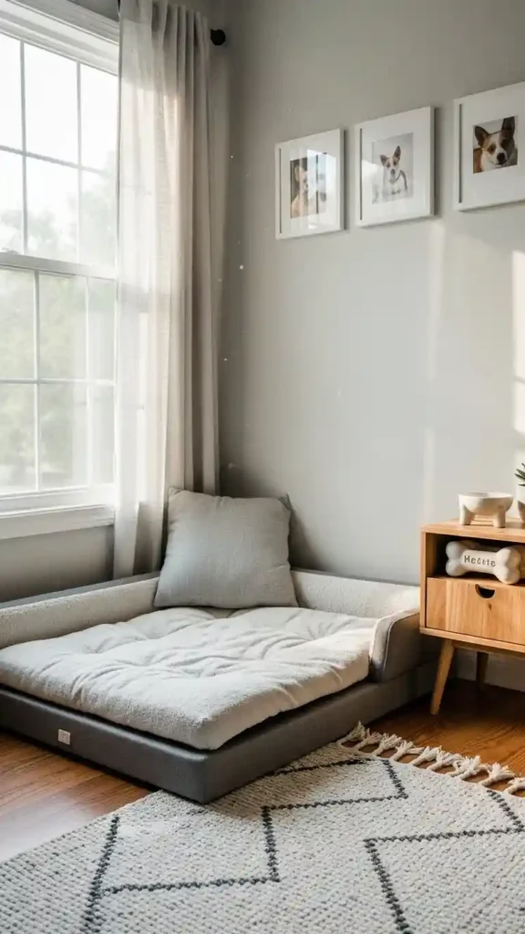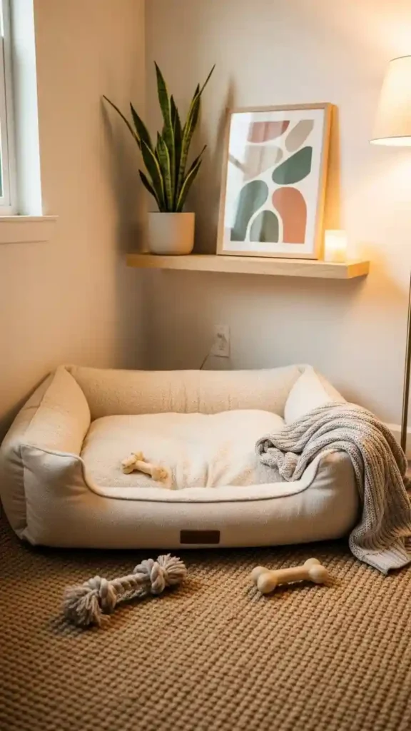 A cozy corner dog bedroom is perfect for pet owners with limited space. This idea transforms an unused corner into a warm, comforting retreat using a soft dog bed, plush blankets, and calming colors. Adding a small rug underneath helps define the space while providing extra comfort. Neutral tones or pastel shades keep the area visually pleasing and blend well with home décor. This setup makes dogs feel safe and relaxed, especially those who enjoy quiet spaces for rest.