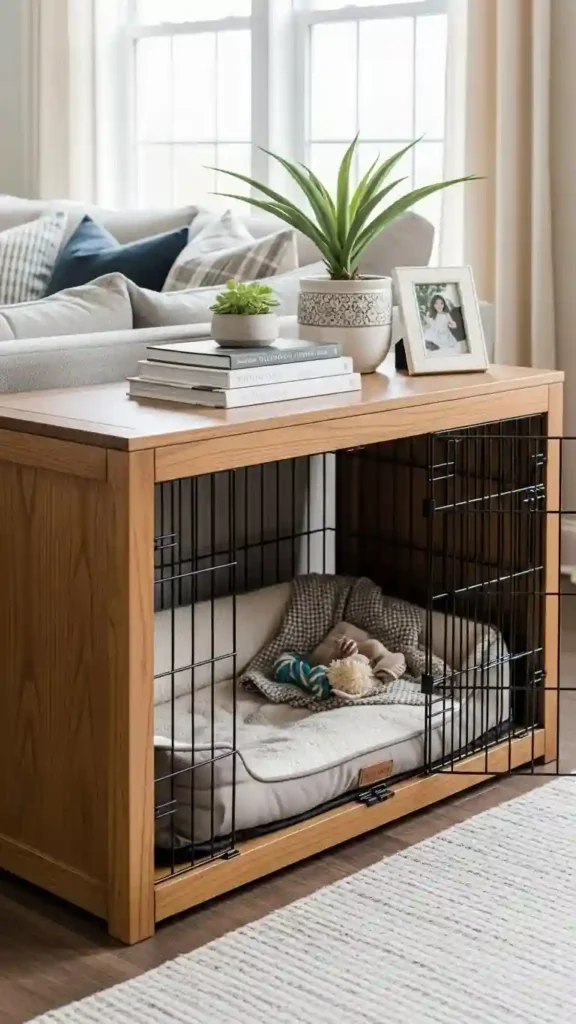 A built-in crate bedroom offers both style and structure. Designed to look like furniture, it blends seamlessly into modern interiors while giving dogs a private sleeping area. Wooden finishes, neutral cushions, and decorative pillows elevate the look, making the crate feel intentional rather than temporary. This idea works well for dogs that enjoy enclosed spaces, providing security and calmness during rest.