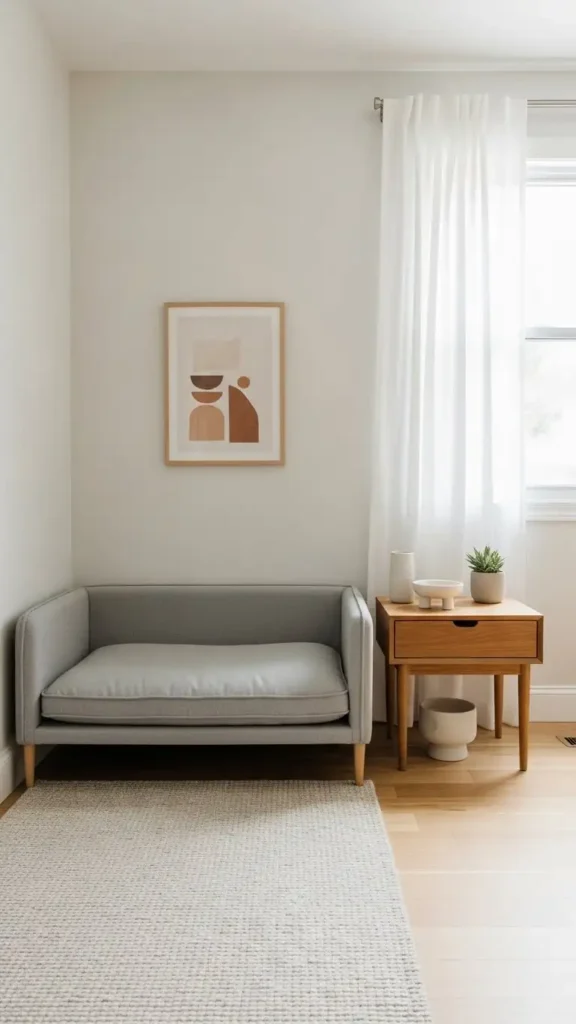 A minimalist dog bedroom focuses on simplicity and calm. Clean lines, neutral colors, and uncluttered layouts create a peaceful environment for dogs. A single high-quality bed, a soft blanket, and a small toy basket are often enough. This style works well for modern homes and dogs that prefer quiet, distraction-free rest areas.