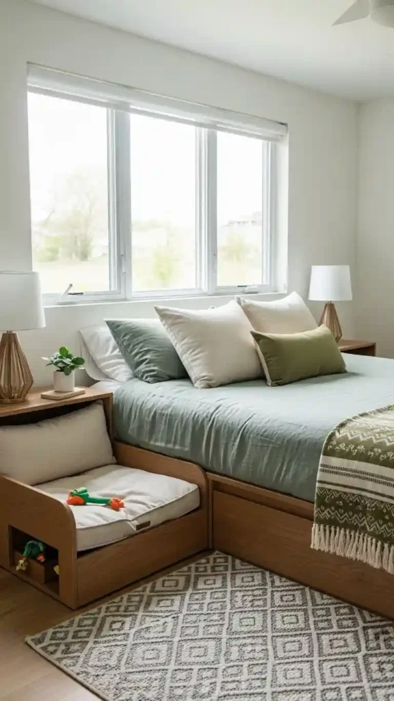 Functionality includes easy-to-clean bedding and organized storage for nighttime essentials. The layout ensures movement without disruption. Pinterest audiences love shared bedroom ideas because they emphasize emotional connection, comfort, and thoughtful design that respects both human and pet needs.