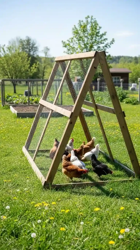 An A-frame chicken pen is one of the easiest structures to build. Two boards form a peaked frame with chicken wire stretched around it. It’s lightweight, easy to move, and requires minimal supplies.