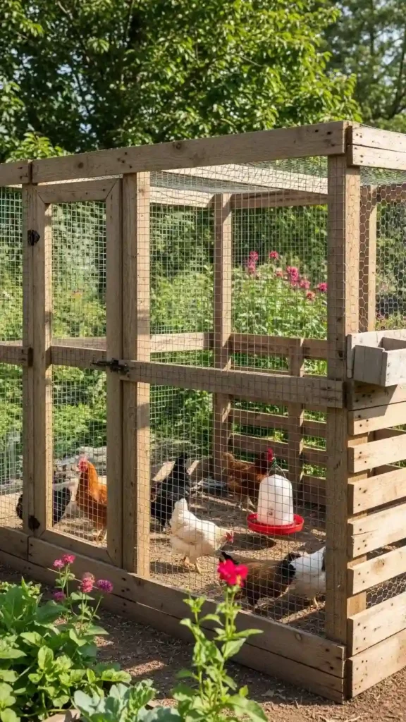 Reclaimed pallets make excellent walls for a DIY chicken pen. With a few reinforcements and some chicken wire, you can create a large, secure pen that’s eco-friendly and budget-friendly.