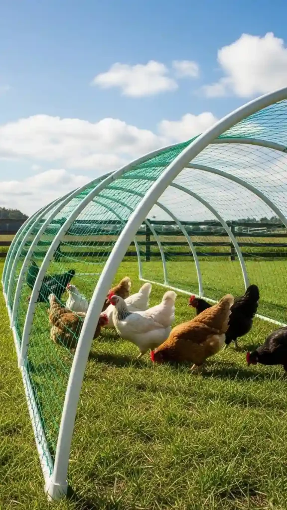 Use PVC pipes to make a hoop-style chicken run. This design is flexible, affordable, and perfect if you want a movable pen you can relocate for fresh grazing.