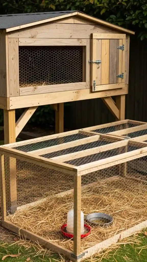 If your yard is uneven or prone to dampness, a raised chicken pen is ideal. Build a frame on sturdy legs and attach a run underneath — your chickens stay dry and protected from ground moisture.