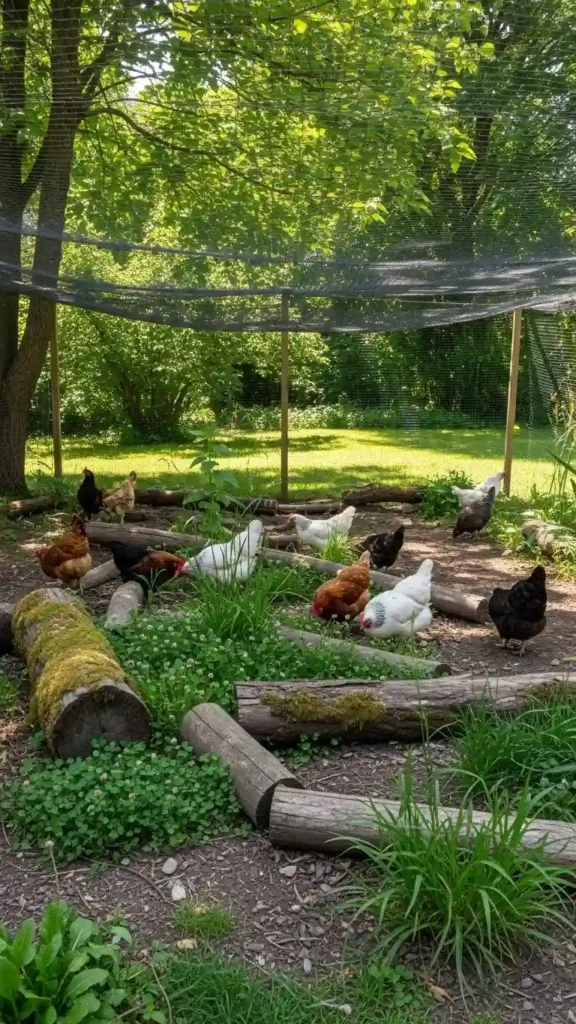 Instead of a closed run, create a naturalistic pen with tall supports and overhead netting. Add plants, logs, and shrubs for enrichment — your chickens get shade, roaming space, and stimulation.