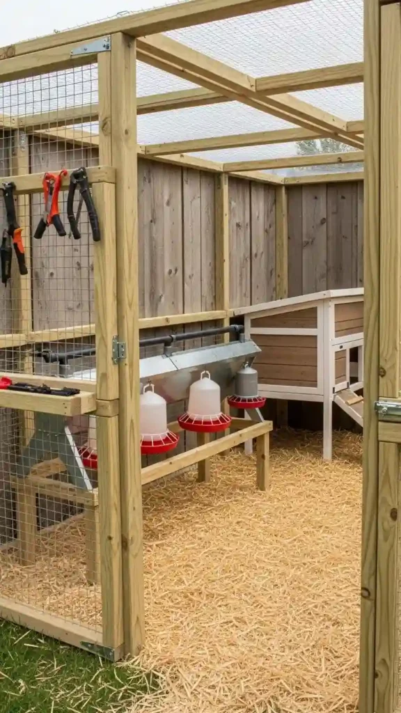 Combine your chicken pen with a built-in feeding station or feeder shelf. This minimizes clutter inside the pen and keeps food dry and off the ground.