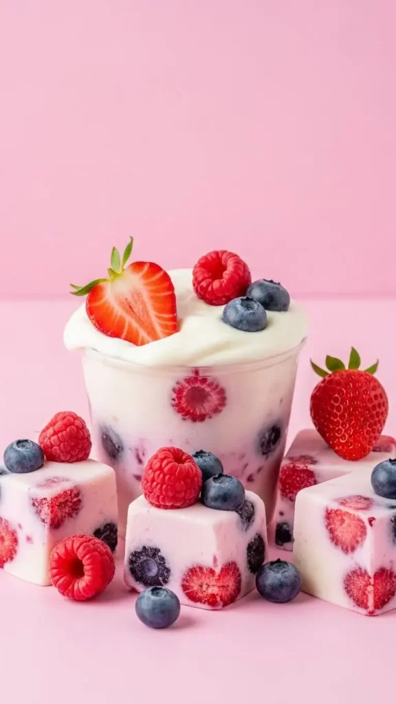 Frozen yogurt and berry cubes combine creamy texture with antioxidants. Mix plain, unsweetened yogurt with fresh or frozen blueberries, strawberries, or raspberries. Pour into ice cube trays and freeze. The berries add natural sweetness and vitamins, while yogurt promotes digestive health.