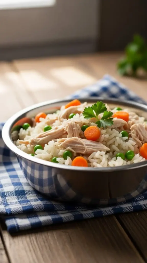 Functionally, this meal is affordable and easy to prepare in batches. It can be stored safely and served warm. Pinterest audiences love chicken and rice meals because they represent comfort, simplicity, and health — making them perfect for beginner dog parents.