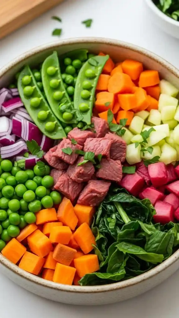 A beef and vegetable bowl offers a hearty and nutritious option. Lean ground beef provides essential protein and iron, while vegetables like carrots, green beans, and spinach add fiber and vitamins. This balanced combination supports muscle strength and overall health. Dogs enjoy the savory taste and satisfying texture.