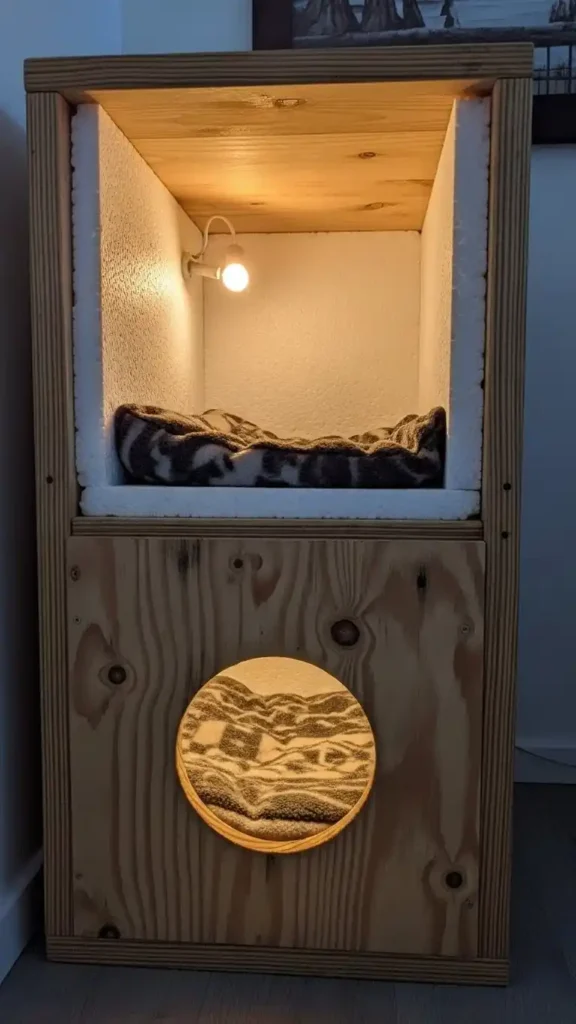 This design uses a simple wooden crate or plywood box as the base, lined with rigid styrofoam panels before adding soft bedding.