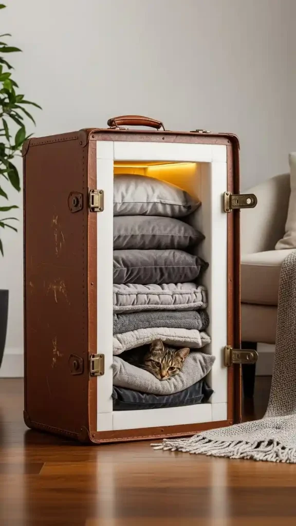 Turn an old suitcase into a charming cat house. Line the interior with foam insulation and plush blankets.
