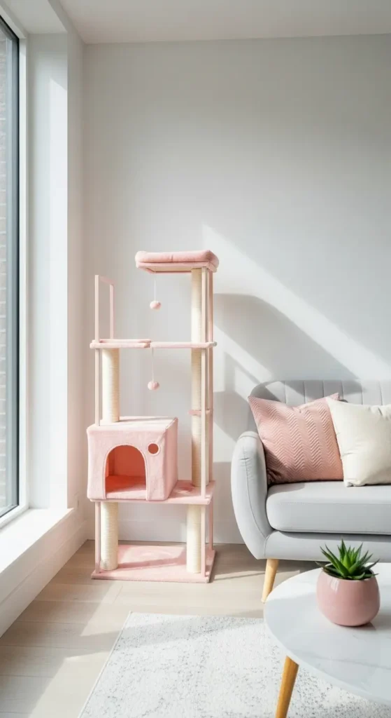 Pastel pink cat towers feel calm, cozy, and inviting. The gentle color adds warmth without being overwhelming.