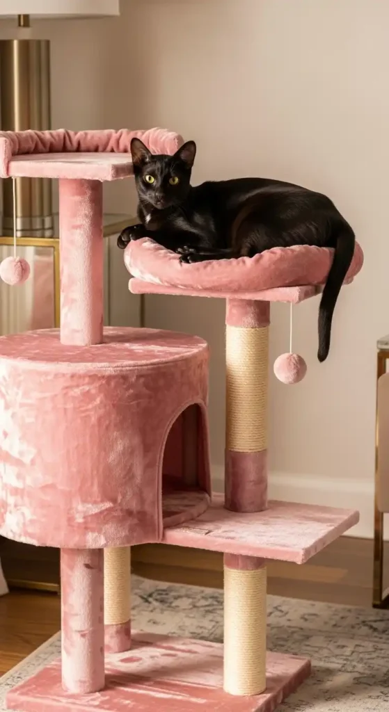 Velvet adds instant luxury, and a pink velvet cat tower feels plush and elegant. Soft textures make it especially appealing for lounging cats.