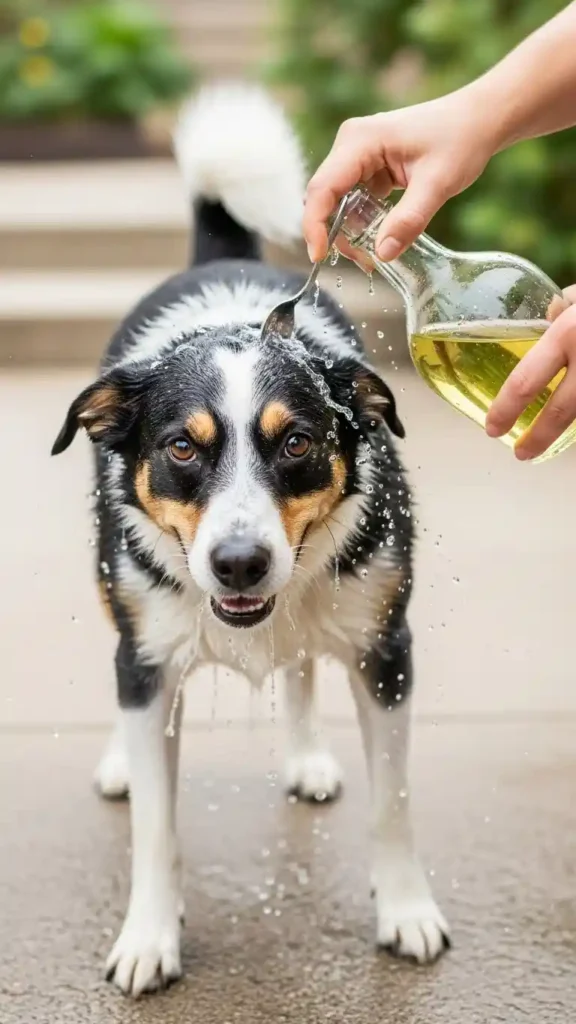 Spray or pour the solution gently over the affected areas. Let it sit for 5–10 minutes, then rinse well. Vinegar also leaves the fur smooth and helps reduce lingering odor.