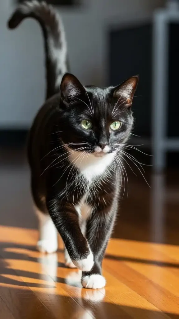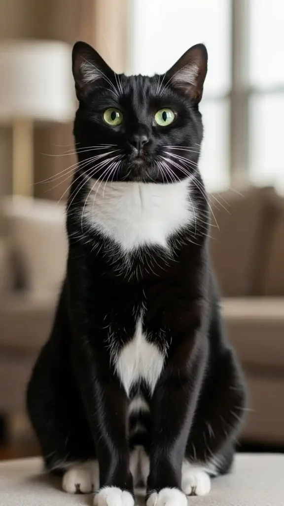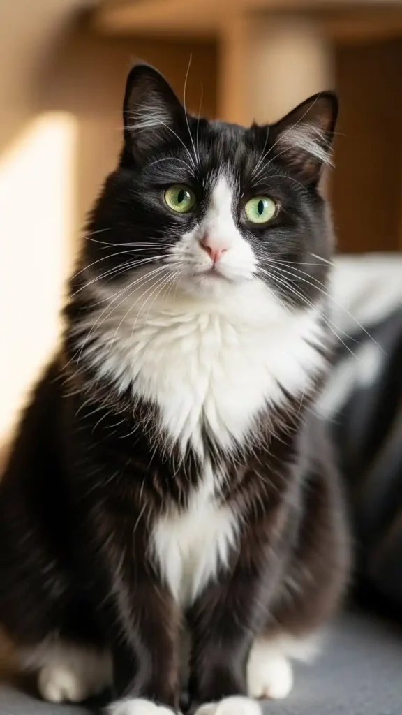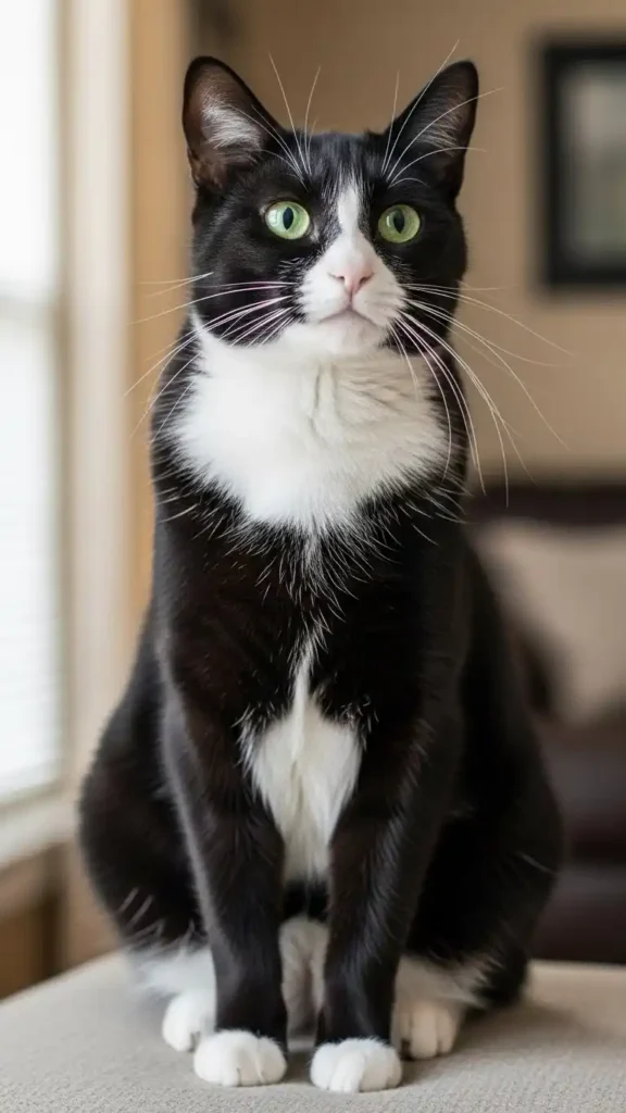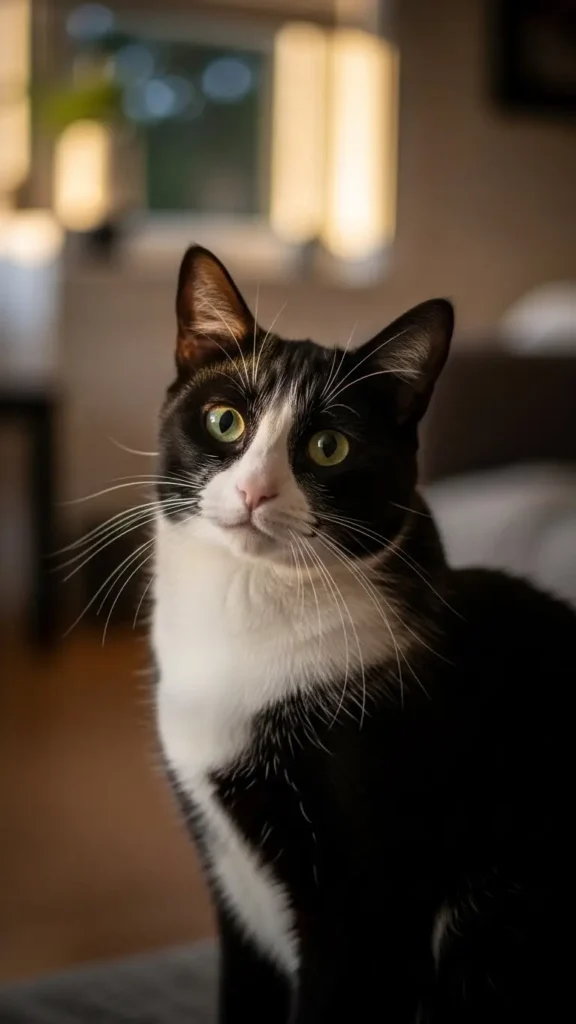 In soft or dim lighting, tuxedo cats’ contrasting black-and-white fur becomes dramatic and eye-catching. The white chest and paws stand out brilliantly against deep black fur, giving a cinematic, gala-ready impression. Whether perched on furniture or exploring a room, their elegance is enhanced by light, shadow, and natural posture.