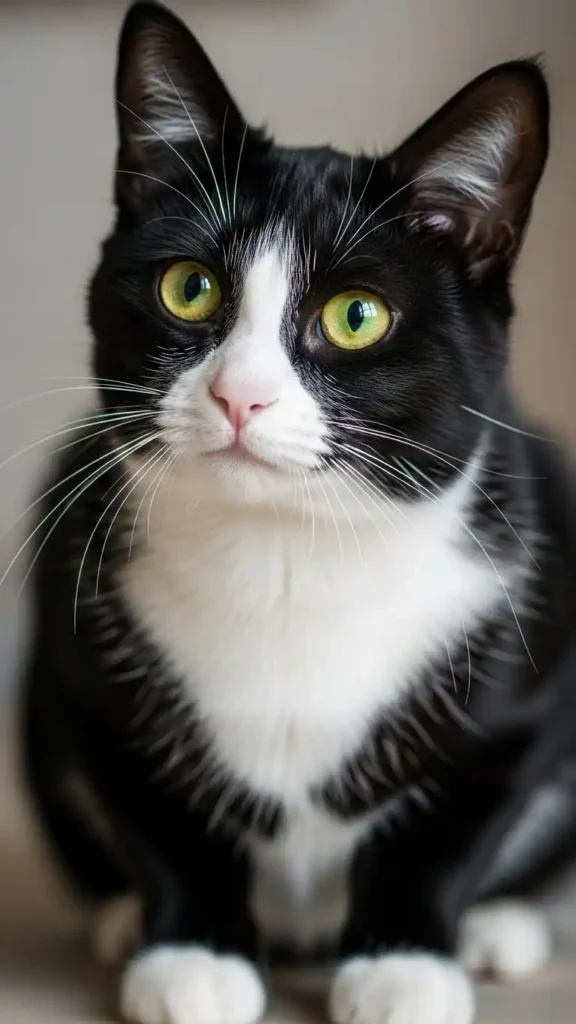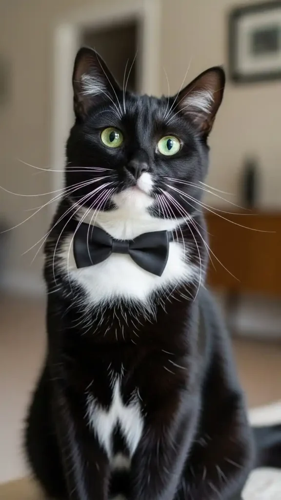 Some tuxedo cats feature a chest marking that perfectly resembles a tiny bow tie, adding an extra layer of charm to their already formal appearance. This natural marking gives the impression of a carefully styled outfit, elevating their elegance without any artificial accessories. Placing such a cat on a cozy couch or a sunlit perch turns every moment into a visual delight, where the bow-tie effect reinforces the gala-ready aesthetic.