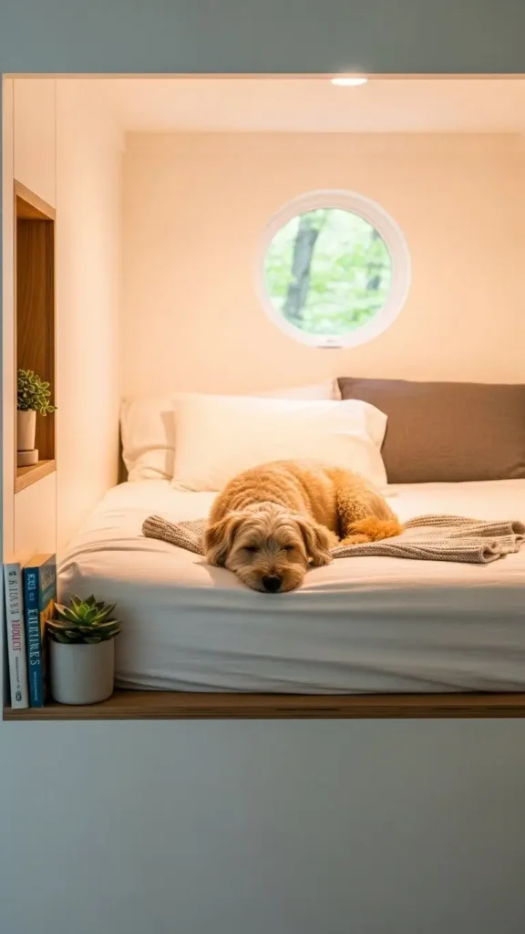 Elevated beds in a small nook can make your dog feel secure and pampered. Raised beds protect joints, provide airflow, and create a sense of space. Adding soft bedding and a favorite toy enhances comfort.