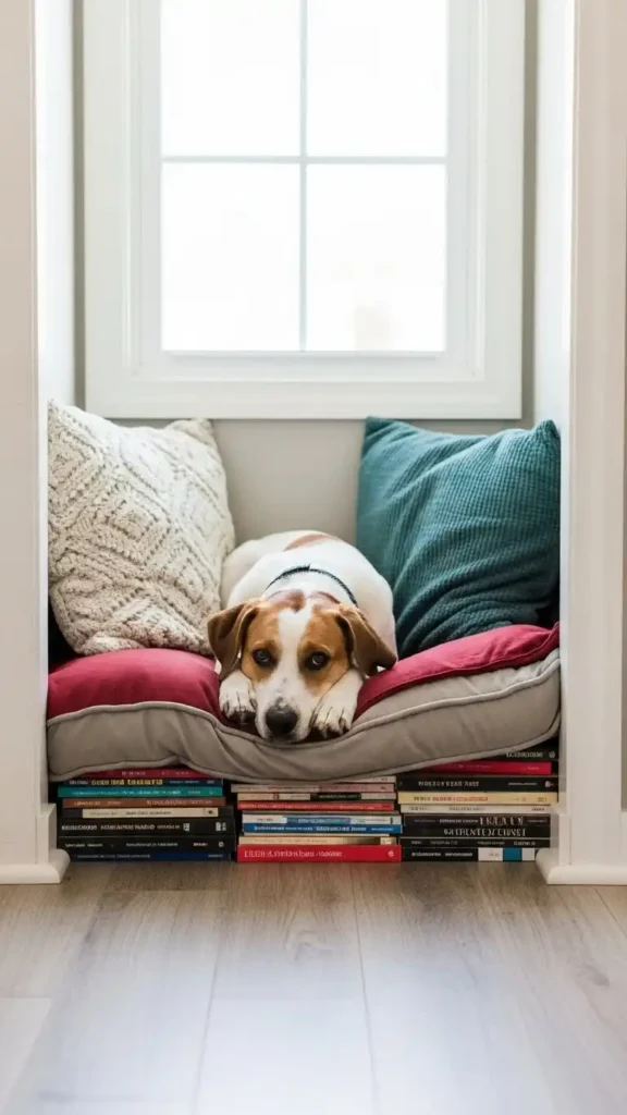 A reading-style nook with pillows and a small rug allows your dog to relax quietly. You can even place pet-safe books or treat puzzles nearby. This encourages calm behavior and mental engagement.