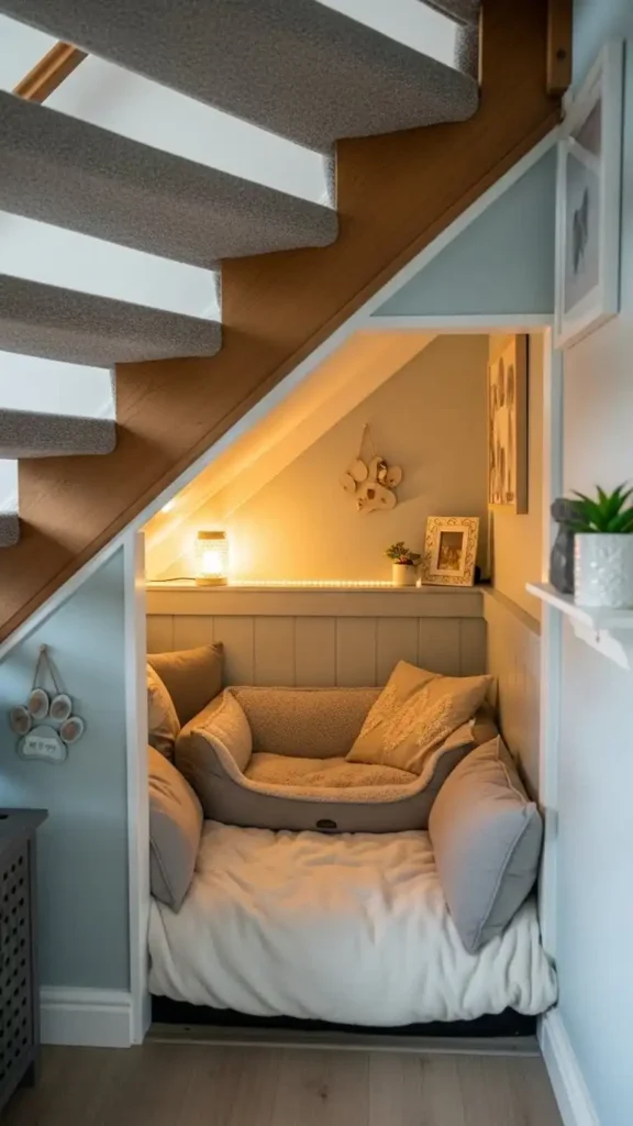 Utilizing space under the stairs for a dog nook is smart and cozy. Add soft bedding, toys, and maybe a small lamp for warmth. Dogs feel secure in these tucked-away spaces.
