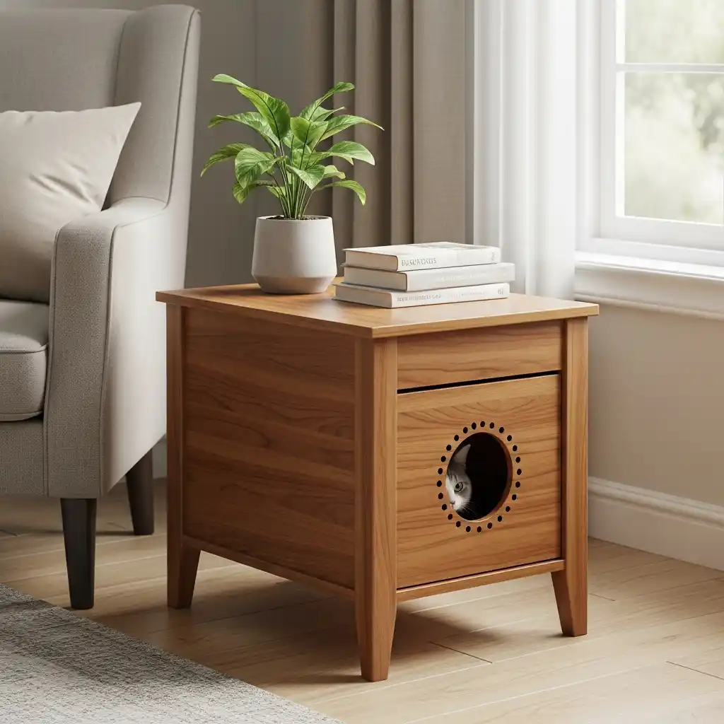 A side table with a hidden compartment can hold the litter box. It blends into your decor without looking like a pet setup.