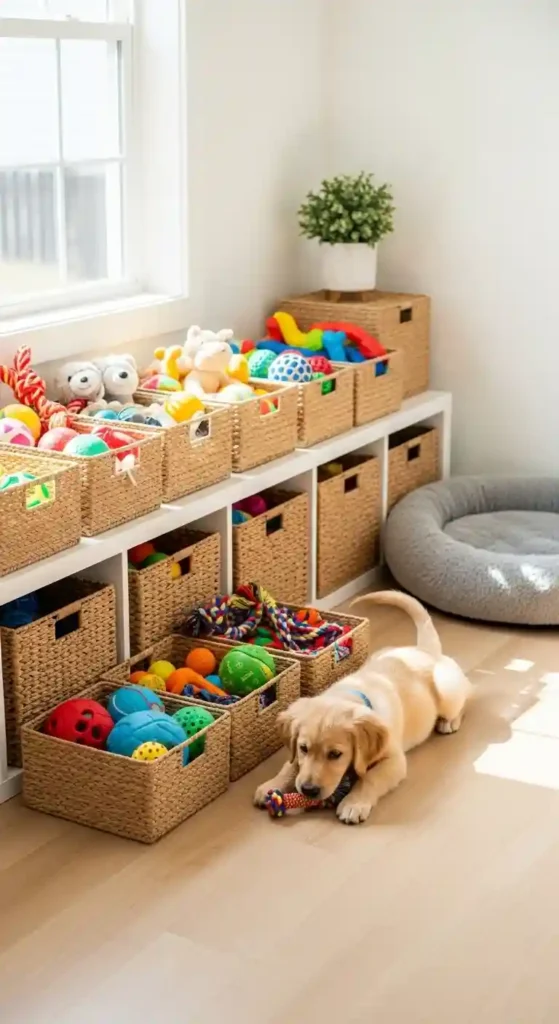 Keeping toys organized prevents overstimulation and clutter. Bins or baskets make it easy to rotate toys and keep the room tidy.