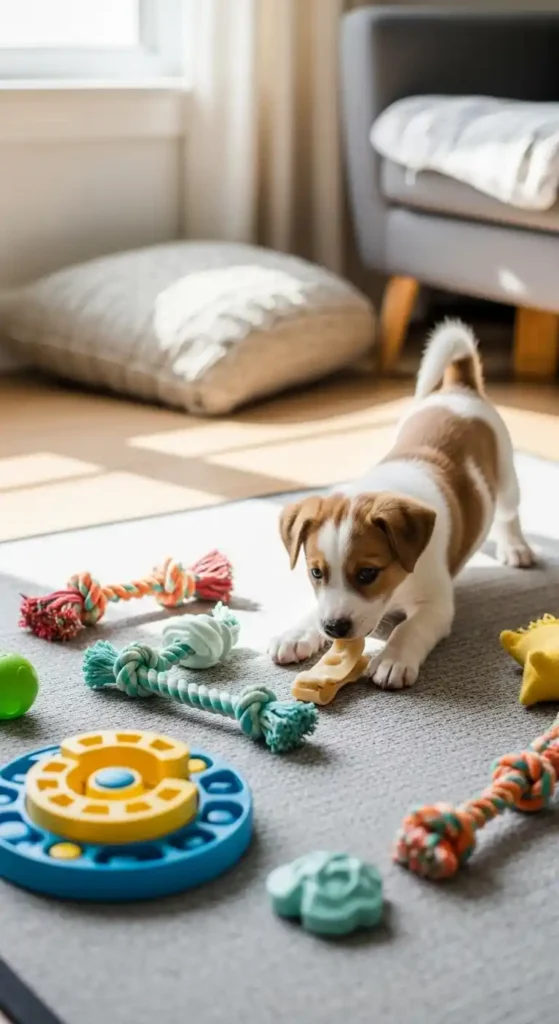 An interactive play area with puzzles, tug toys, and chew-safe items keeps puppies mentally engaged. This helps reduce boredom-related behaviors.