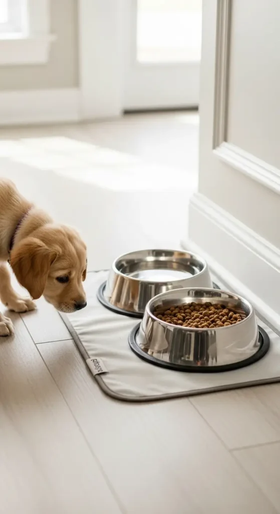 A dedicated feeding area helps puppies learn routine and structure. Spill-proof bowls and washable mats keep the space clean.